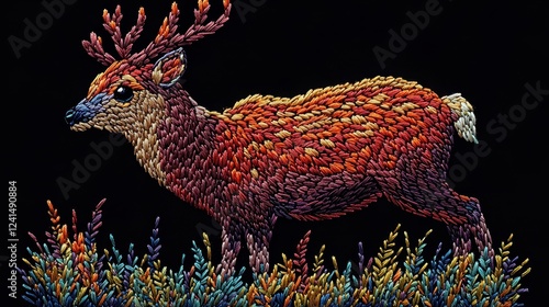 © Kanimalia, Obraz premium Vibrant Thread Deer Embroidery Art Detailed Wildlife Nature Artwork