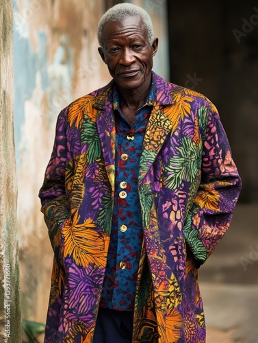 © Jaemie, Obraz premium Vibrant Togo Fashion: A man in a colorful patterned coat showcasing traditional African attire against a rustic backdrop.
