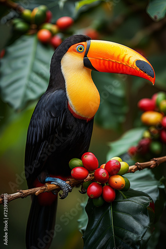 Obraz premium Vibrant Toucan Amidst the Coffee Harvest - AI Generative