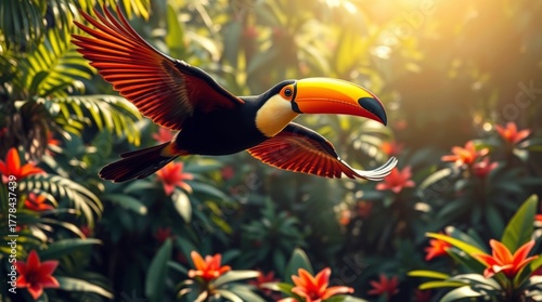 Fototapeta premium Vibrant Toucan in Flight Against a Lush Tropical Background with Colorful Flowers and Warm Sunlight