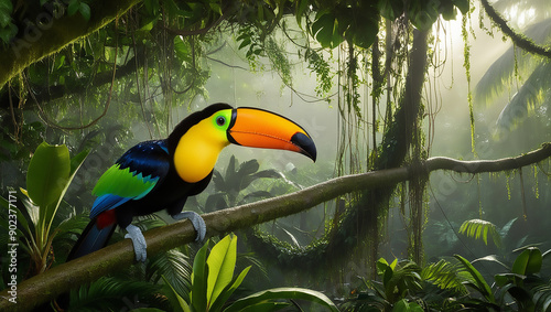Naklejka premium Vibrant Toucan in the Rainforest Canopy