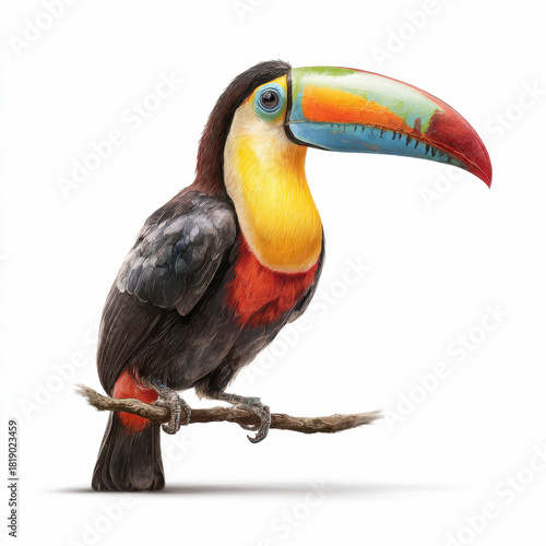 © Julia Jones, Naklejka premium Vibrant toucan perched on branch with colorful beak and feathers on white background