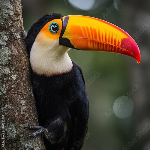 © BerkahStock, Naklejka premium Vibrant toucan perched on tree trunk, showcasing its colorful beak and striking eyes.