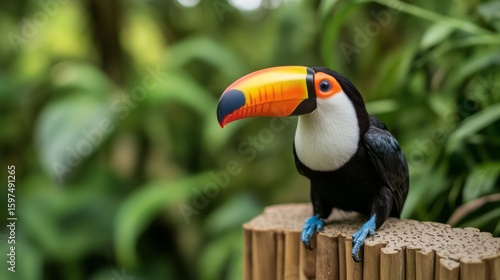 © Nongkran, Naklejka premium Vibrant Toucan Perched on Wooden Barrier Amid Lush Greenery in Tropical Environment
