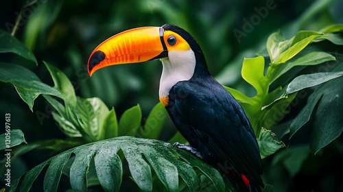 Naklejka premium Vibrant Toucan Sitting on Leaf Amid Lush Green Tropical Foliage