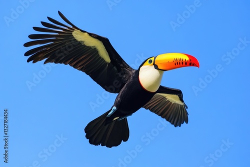 © Serhii, Fototapeta premium Vibrant Toucan Soaring in Clear Blue Skies: A Stunning Display of Nature's Beauty