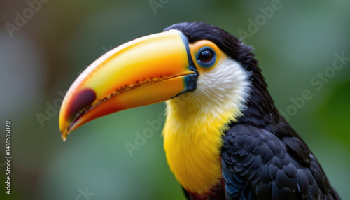 © Thanapipat, Obraz premium vibrant toucan with striking yellow and orange beak stands against blurred green background