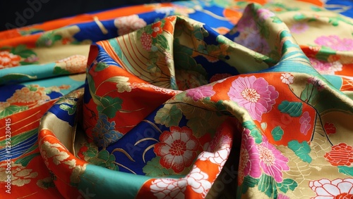 © Giovanni, Fototapeta premium Vibrant traditional Japanese silk fabric draped elegantly showcasing intricate floral patterns and rich colors for textile design inspiration.