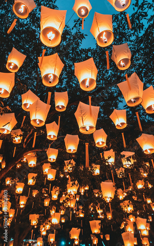 © Vilius, Naklejka premium Vibrant Traditional Lanterns Hanging Illuminated at Night with Intricate Designs, Cultural Decoration, Warm Glowing Lights in Air, Festival Atmosphere