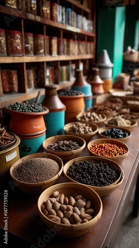 Fototapeta premium Vibrant traditional spice shop display with colorful ingredients in wooden bowls