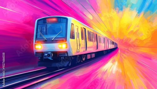 Naklejka premium Vibrant train speeding through a colorful abstract tunnel, dynamic and energetic feel.
