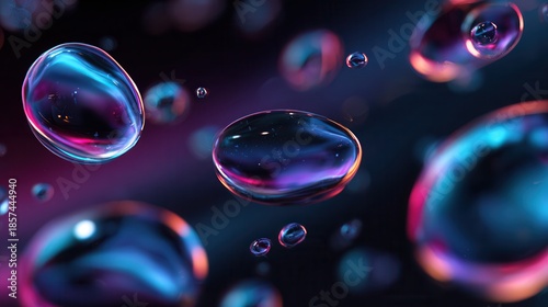 © Eugene Okorskiy, Naklejka premium Vibrant translucent bubbles floating in dark space with neon light