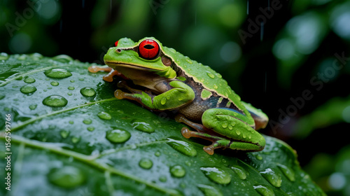© Abdullah, Naklejka premium Vibrant tree frog rests on a leaf covered in raindrops, a nature close-up