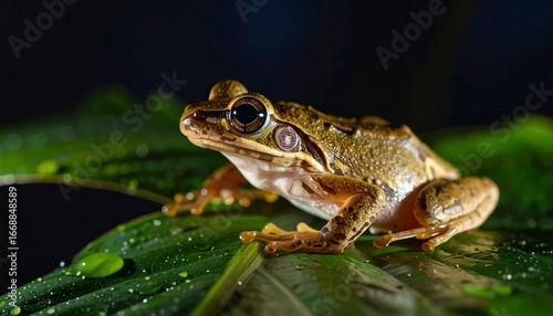© Digivault, Obraz premium Vibrant Tree Frog with Golden Eyes Perched on Dewy Green Leaf in Soft Bokeh Light