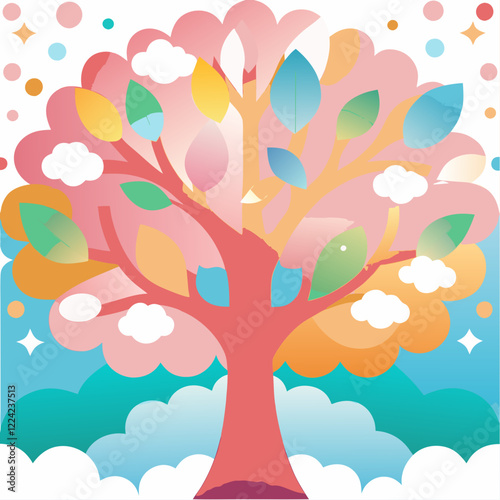 Fototapeta premium Vibrant tree illustration with colorful leaves and whimsical background, cheerful mood, designed in a playful art style