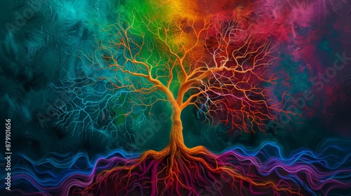 © Jenjira, Obraz premium Vibrant tree with colorful branches and roots illuminated against a dark background, representing connection and growth in a mystical setting.