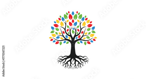 Naklejka premium Vibrant tree with colorful leaves illustration representing growth, diversity and nature's beauty for sustainable and eco-friendly projects