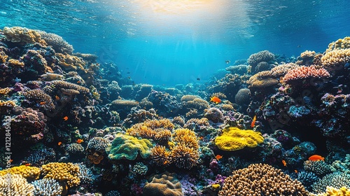 Naklejka premium Vibrant Triple-Layer Nature Composite: Evening Sky, Turquoise Sea, and Sunlit Underwater Marine Life