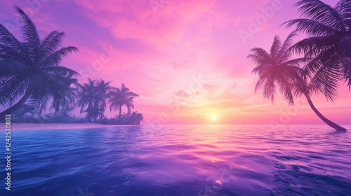 Fototapeta premium Vibrant Tropical and Exotic Sunset over a tropical lagoon with vibrant orange and purple hues reflecting on the calm waters.