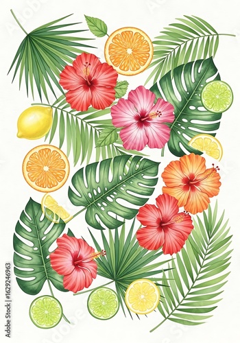 © Suroto, Naklejka premium Vibrant tropical arrangement showcasing hibiscus blooms and an array of citrus fruits amidst palm
