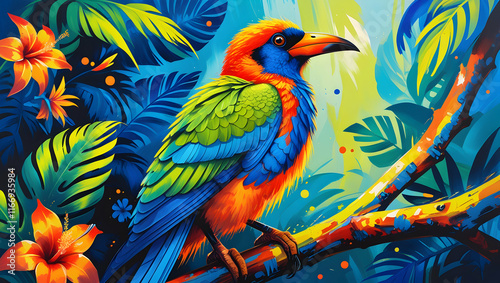 © Surya, Obraz premium Vibrant tropical bird perched on a branch amidst lush foliage.