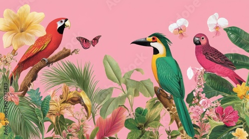 Obraz premium Vibrant tropical birds and flowers on pink background.