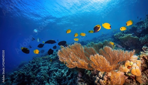 © netsay, Naklejka premium Vibrant Tropical Fish Swim Amongst Colourful Coral Reefs in the Depths of the Underwater Wildlife, Showcasing a Breathtaking Scene of Aquatic Beauty and Diversity.