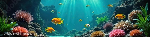 © Thanawat, Naklejka premium Vibrant Tropical Fish Swimming in a Lush Aquarium A captivating scene of colorful corals, lively movement, and brilliant hues, perfect for home aquarium enthusiasts and nature lovers.