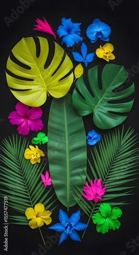 © narumiaegis, Obraz premium Vibrant Tropical Flowers and Leaves A Bold, Colorful Composition