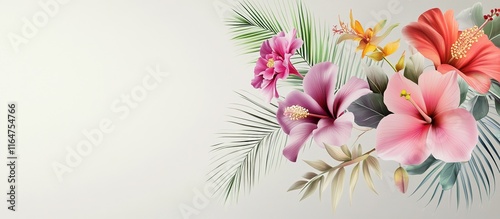 © Galaxyd, Obraz premium Vibrant tropical flowers and palm leaves on a light background.
