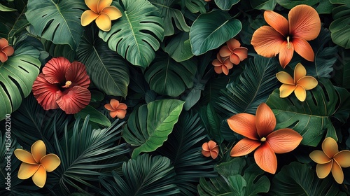 Fototapeta premium Vibrant tropical foliage featuring various flowers and leaves in a lush...