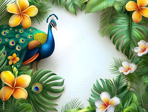 © Eakanan, Naklejka premium Vibrant Tropical Peacock Surrounded by Lush Floral Foliage and Exotic Plants