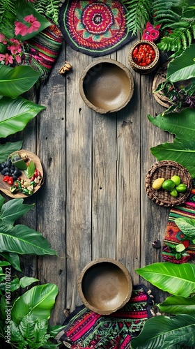 Fototapeta premium Vibrant Tropical Plants and Bowls on Rustic Wood