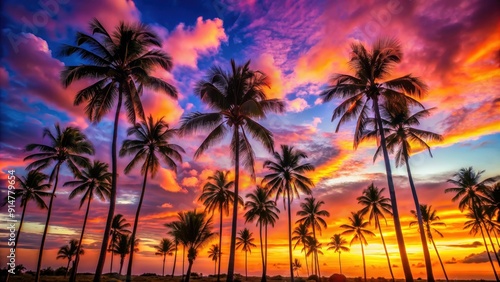 Obraz premium Vibrant tropical sunset with a colorful sky and palm trees silhouetted,...