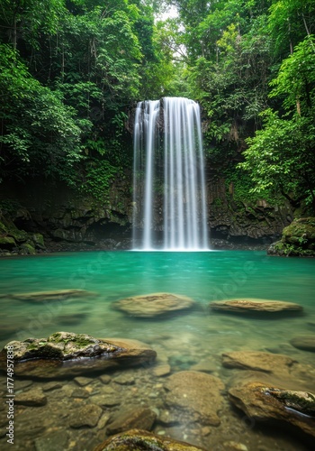Fototapeta premium Vibrant tropical waterfall plunging into a clear turquoise natural pool...