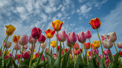 Fototapeta premium Vibrant Tulip Field Against Blue Sky