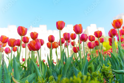 Fototapeta premium Vibrant Tulip Field Blooming Under Clear Blue Sky in Spring