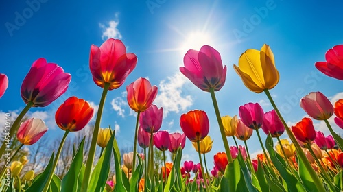 Fototapeta premium Vibrant tulip garden against a clear sky, viewed from a low angle