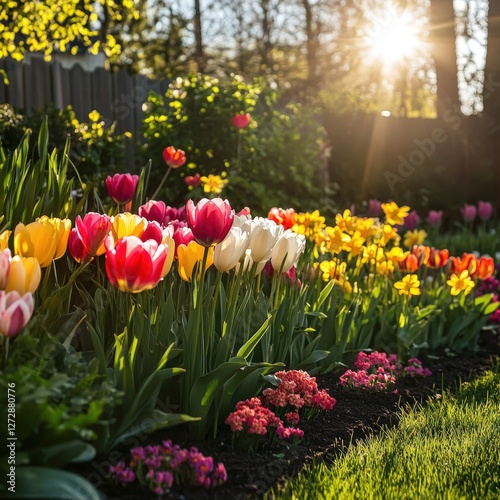 Fototapeta premium Vibrant Tulip Garden in Bloom Under Soft Morning Sunlight with Dazzling...
