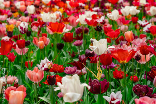 Fototapeta premium Vibrant tulip garden in full bloom showcasing a variety of colors during springtime in a public park setting