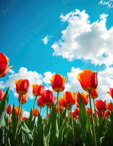 Fototapeta premium Vibrant tulips bloom under a brilliant blue sky dotted with fluffy clouds, scene, daytime, image