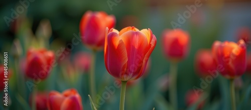© Cherrisa, Obraz premium Vibrant tulips in a garden, showcasing vivid red hues and intricate patterns.