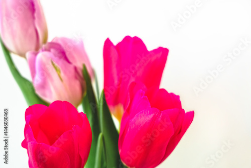 Fototapeta premium Vibrant tulips in pink and red colors arranged elegantly in a bright setting