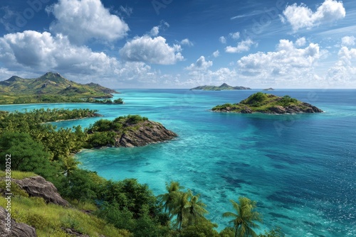 Fototapeta premium Vibrant turquoise ocean waters surround lush green tropical islands under a...