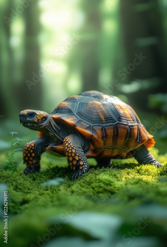 Obraz premium Vibrant Turtle on Lush Green Moss Surrounded by Soft Light in a Serene Forest Setting with Ethereal Background Elements for Nature Lovers