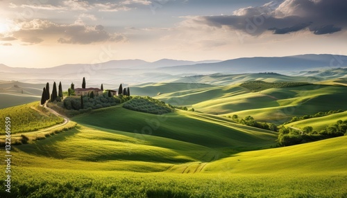 © netsay, Fototapeta premium Vibrant Tuscan Sunset Over rolling Hills, Cradling Ancient Stone Villages in a Warm Gilded Glow, Chasing Away the Twilights Shadow with its Romantic Brilliance. If the title is below characters