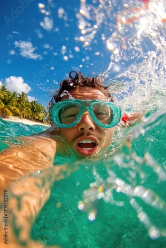 © kvladimirv, Fototapeta premium Vibrant Underwater Adventure: Young Swimmer Exploring Tropical Waters with Goggles