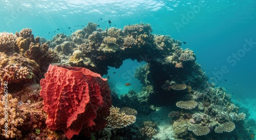 © JAHIRUL, Naklejka premium Vibrant underwater archway formed by coral reef with red sponge