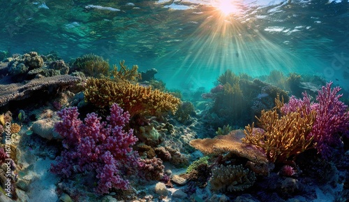 Obraz premium Vibrant Underwater Coral Reef Ecosystem Illuminated by Sunbeams.