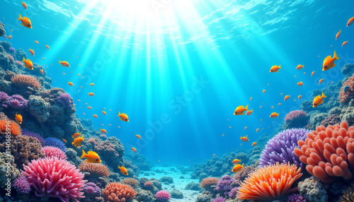 Naklejka premium Vibrant underwater coral reef illuminated by sunlight with schools of...